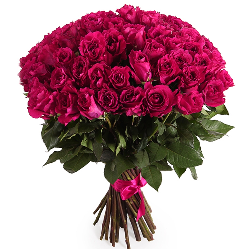 Букет состоит из 55 малиновых роз, прозрачная упаковка, атласная лента.
