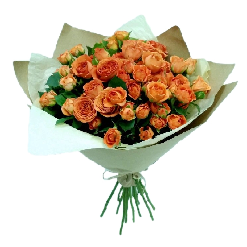 Букет состоит из 15 оранжевых кустовых роз, крафт, атласная лента.